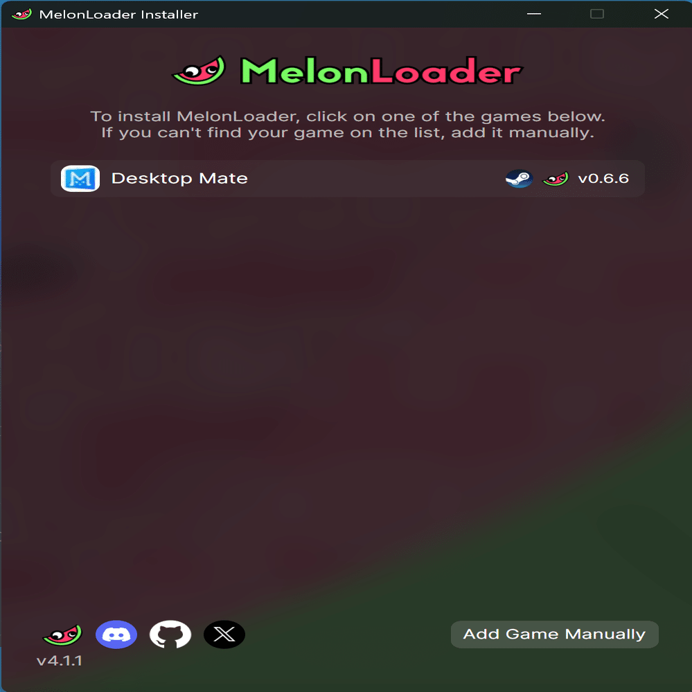 通常は、インストーラーが自動でアプリを検出しますが、検出されない場合は「Add Game Manually」などから DesktopMate のフォルダを指定します。