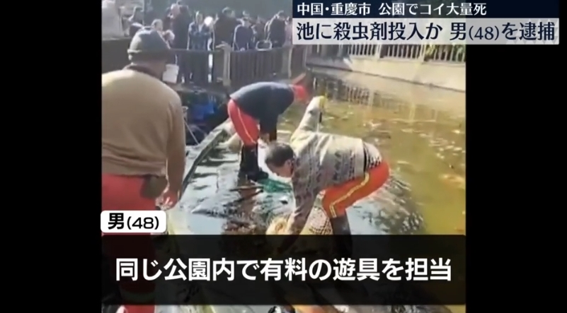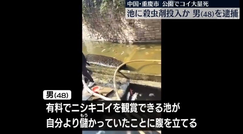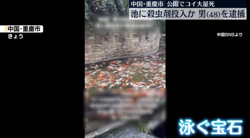 中国内陸部の重慶市の公園で、池のコイが大量に死んでいるのが見つかりました。地元警察は、池に刹虫剤を投入したとして48歳の男を逮捕しました。