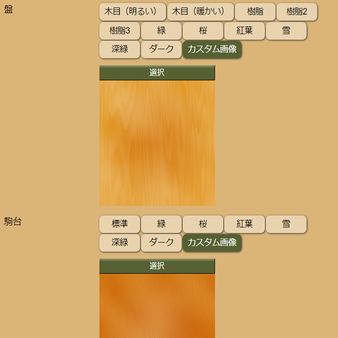 盤や駒台も同様に「カスタム画像」を選択すると好きな木目画像を使うことが可能です。