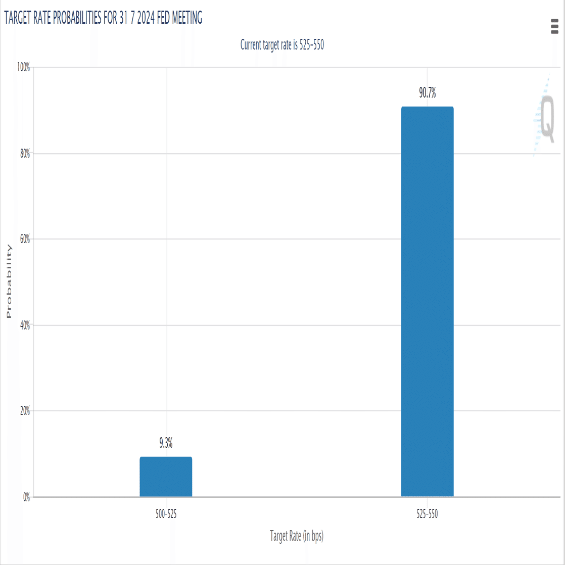 7月で言えば据え置きが90%とほぼ確定なので、政策金利が据え置きでも動きません、これが半々や6:4で割れてると値幅に繋がります。