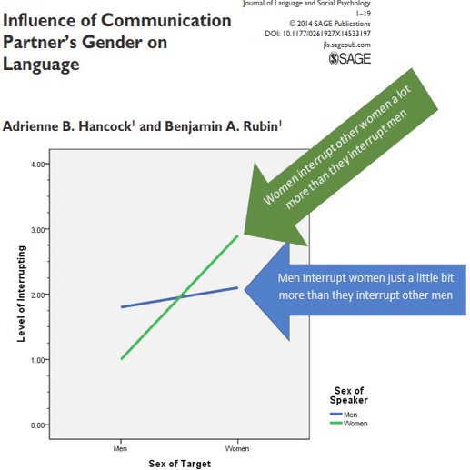 しかし、これをもって単純に「やっぱり女性は女性という理由で話を遮られるんだ!軽視されるんだ!」と解釈することは出来ない。何故なら女性は女性は男性より遥かに多い頻度で、女性の話を妨害することが確認されたからだ。