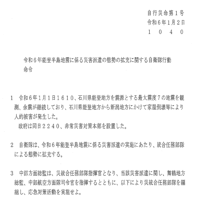 能登半島地震が発生した2024年1月上旬に防衛大臣から出されたすべての命令に関する行政文書について、筆者が防衛省に開示を請求したところ、その対象として特定されたのは、1月4日までに限ると、1月2日午前10時40分に発された「能登半島地震に係る災害派遣の態勢の拡充に関する自衛隊行動命令(自行災命第1号)」の1件だけだった。