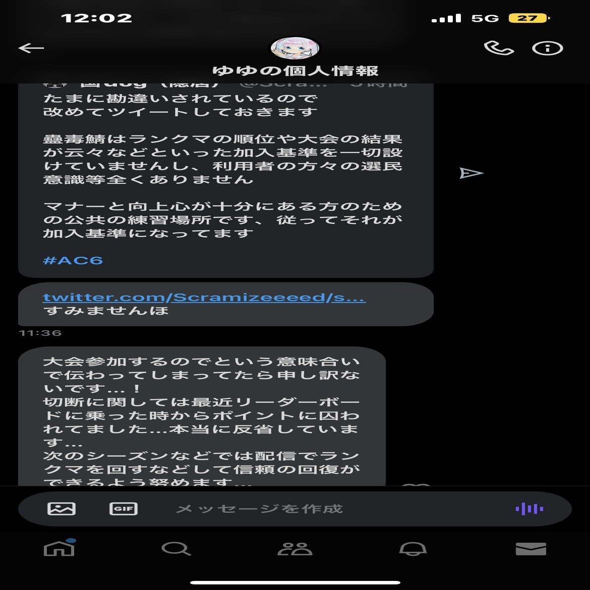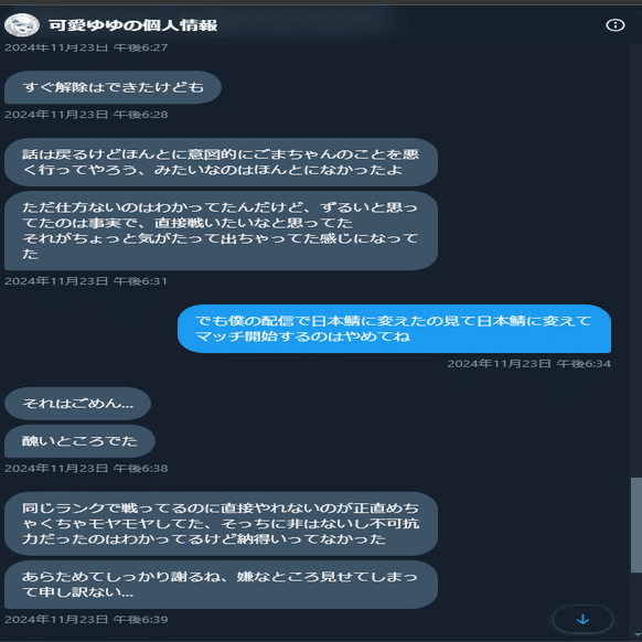 可愛ゆゆにランクマッチ最終日ゴースティング行為を行ったことは本人のDMから確定事項とみて間違いなく、それについては本人も反論の余地は無いと思います。