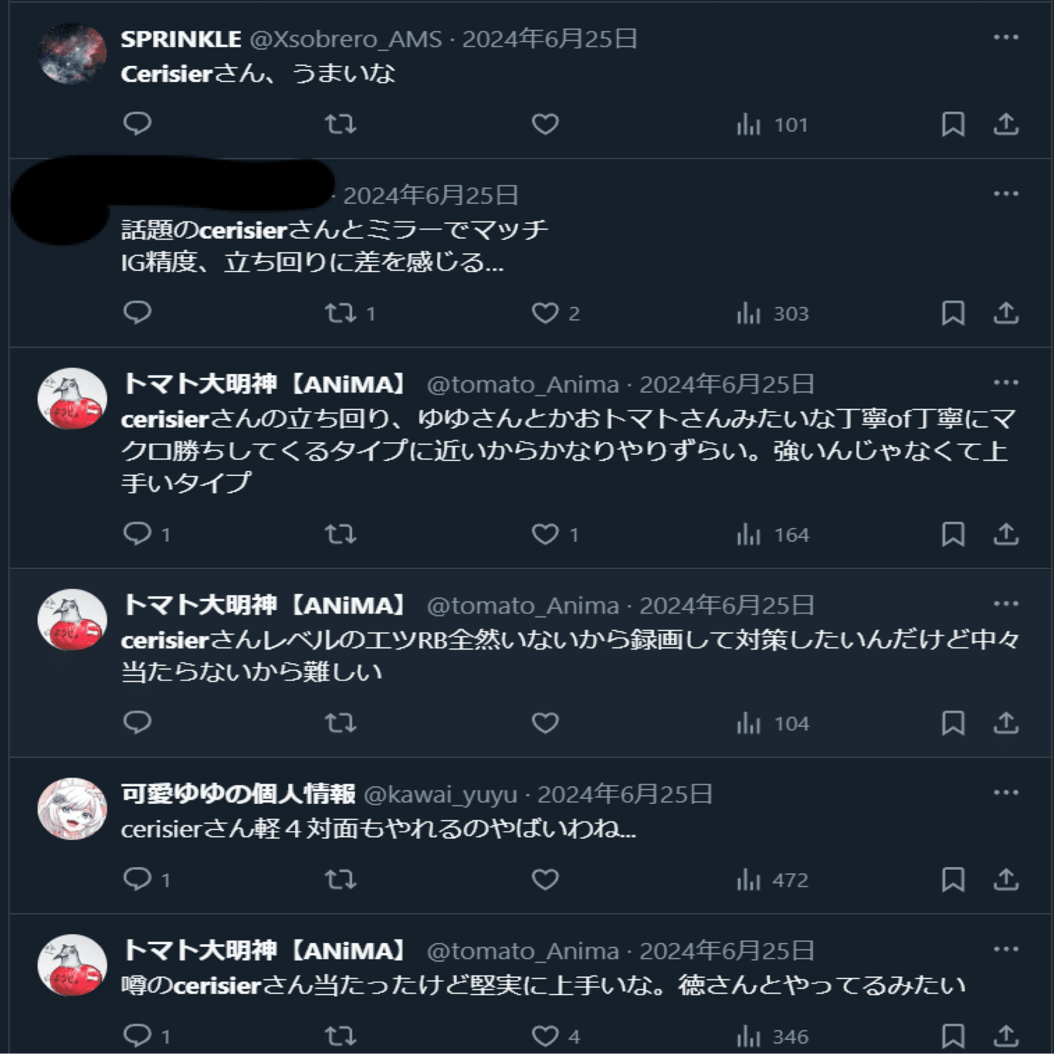 また、Cerisierの実力が極めて高く、そのうえで口頭での証言やXでのテキストから、戦い方が可愛ゆゆと似ているという発言が観測されています。