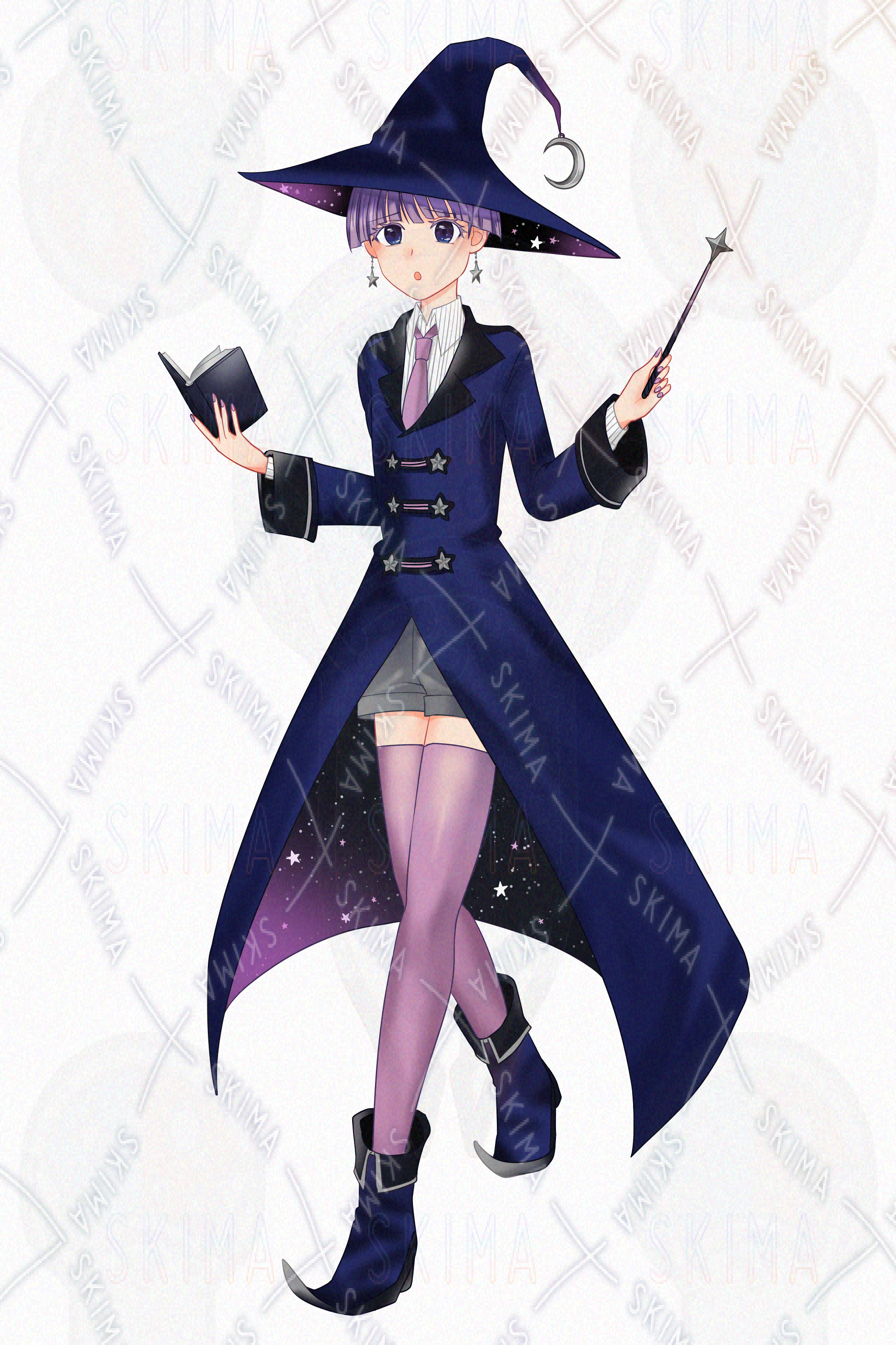 (女性・女の子・中性的・男の娘・ショートカット・魔法使い・魔女・夜空・星空・月・紫・穏やか・クール)
