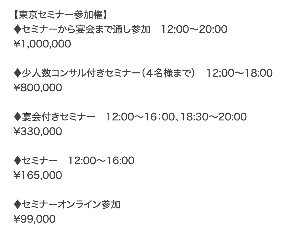 冗談みたいな参加費ですが、類(バカ)は友(バカ)を呼んでそこそこ集客できちゃってますから、もうマノアの未払金500万円くらいは余裕で稼いだはず。