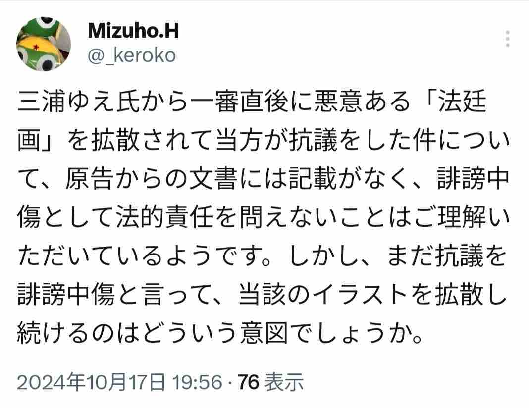 三浦さんが該当の法廷画をリポストしたのは一度きりであり、しかも元の投稿は間もなく削除され、見えなくなったのですから。