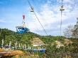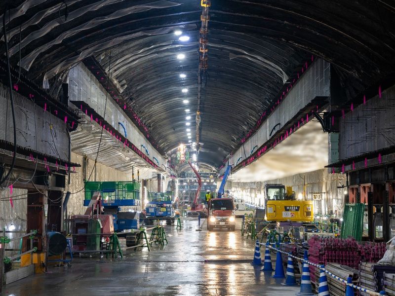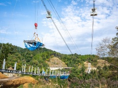 安威川ダム周辺整備事業の一環で、2025年の春ごろの開業を目指して日本最長の歩行者専用吊り橋「GODA BRIDGE」の建設が進む。安威川の両岸に立つ2本の主塔を結ぶメインケーブル(主索)上を、ゴンドラのような形の足場が移動しながら、桁と床版を一体化した「床板材」を架けていく。