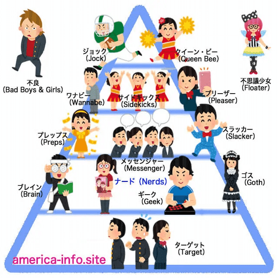 正直に言うと、男性の世界とはそもそも美形とか元々評価する世界ではなかったように思える。特に力強くたくましい男前なんていうのは多くの男性から尊敬というか惹かれるところがあるが、中性的な美形男子というのは、何かしら男性の世界で評価されるようなスキル・能力がないと何も見られないというか、そもそも中性美形とかそういうのを男性が良いと判断しているのかどうかすら疑わしい。以下に示すのは有名なスクールカースト図である。