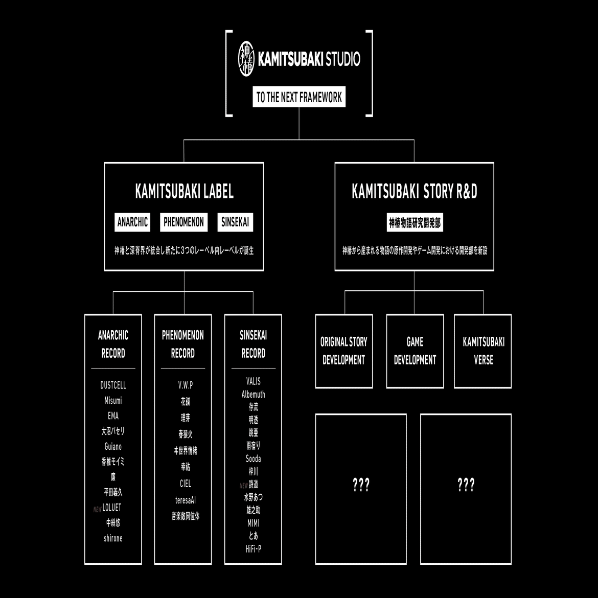 神椿と深脊界の音楽部門を統合した「KAMITSUBAKI LABEL」とIP開発部門を一つにまとめた「KAMITSUBAKI STORY R&D(神椿物語研究開発部)」、