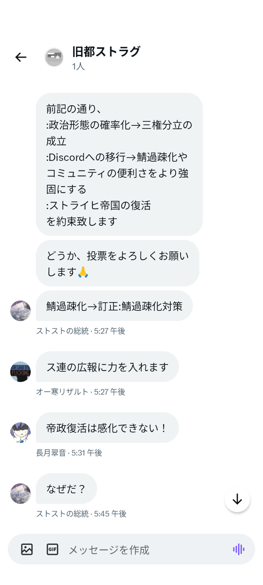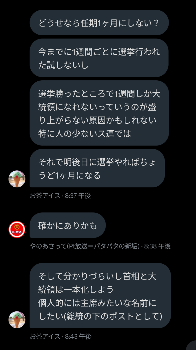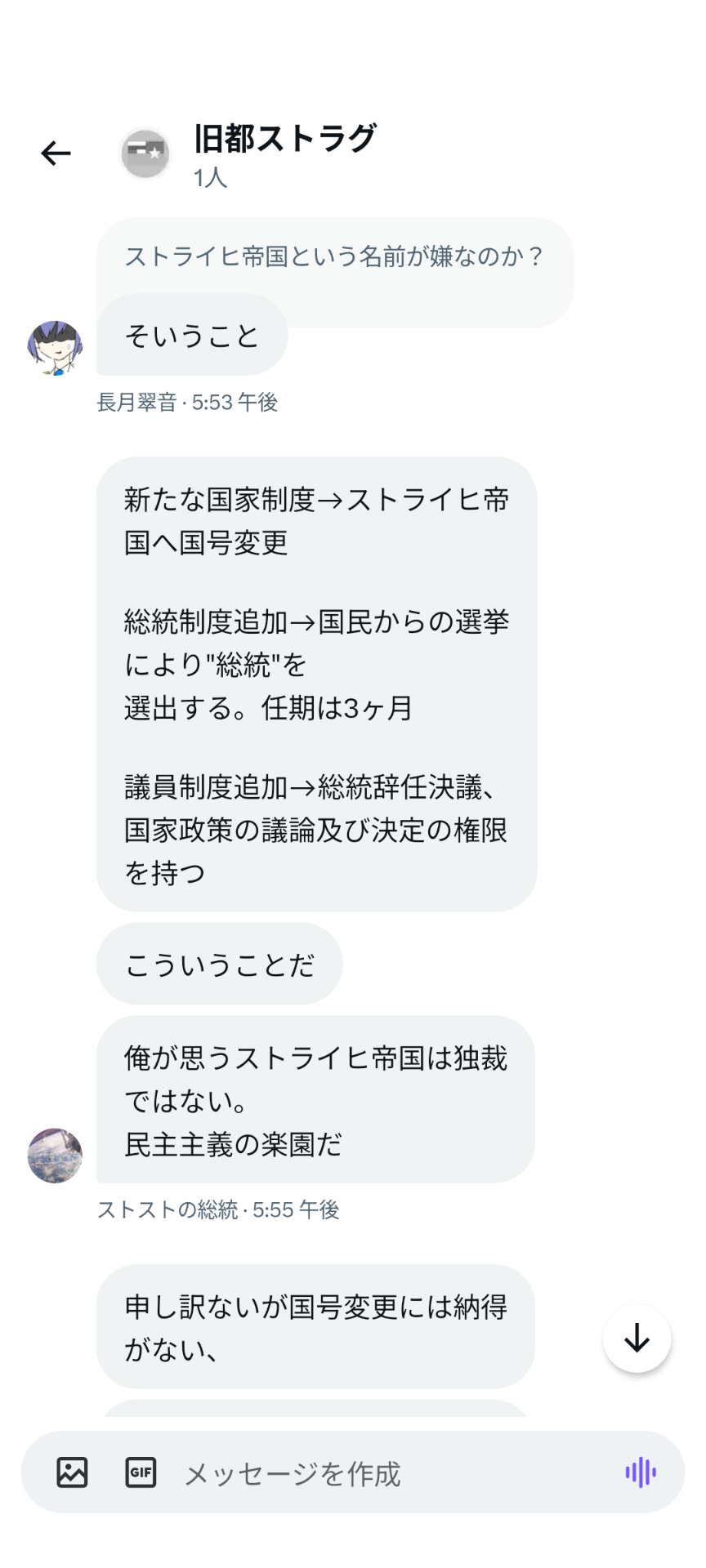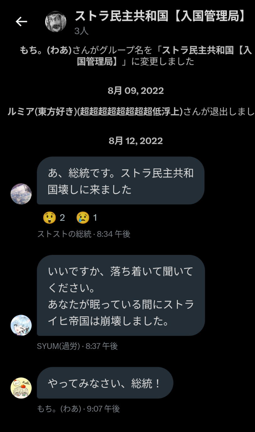 2023年10月7日、ストラナーが大統領選に出馬し、「国名をストライヒ帝国に戻す・Discord移転・大統領の任期を1ヶ月にする」という公約を出したところ、ス連期から参加したメンバーである伊吹氏が反発しちょっとした喧嘩となった。この選挙ではストラナー氏は落選したものの上記の改革を要望し続けていたため、選挙後も度々伊吹氏と喧嘩になった。しかしこの要望は結果として下記の革命に繋がり全て実現される事となる。