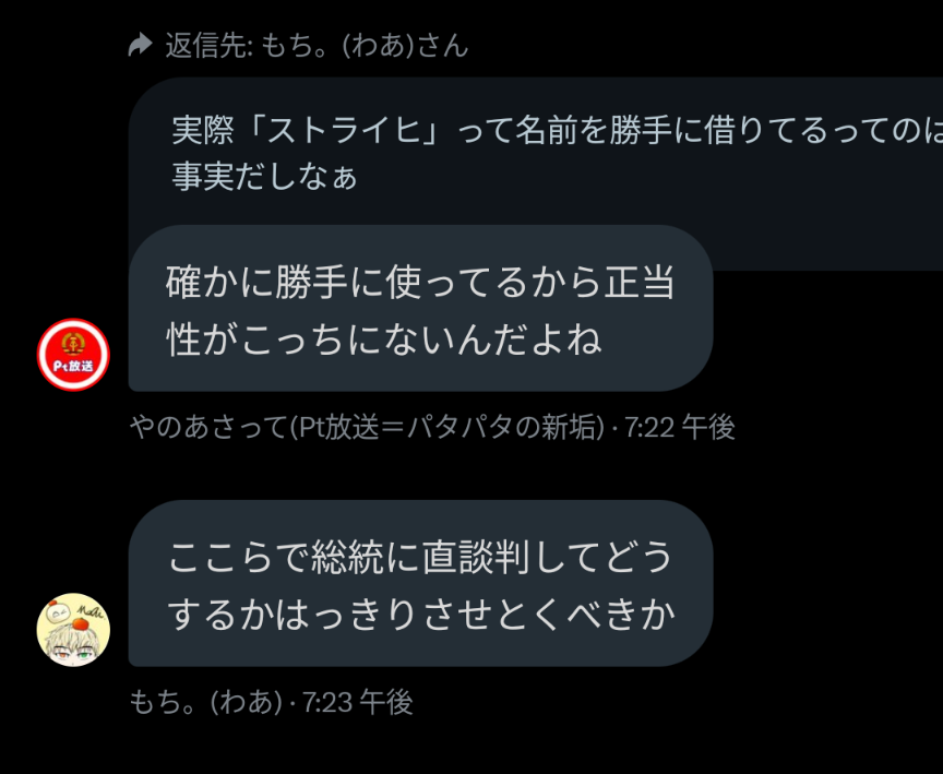 しかしある時期にやよいどきというPBerととある理由で喧嘩になってしまい。この時に作られたbotであるすとらなー語録bot(初代)に感銘を受けたお茶(当時はのーまるじゃっぷ名義だった)が、初代の垢消し後2代目ストラナー語録botを勝手に襲名し、その後建国したのがストライヒ帝国である。