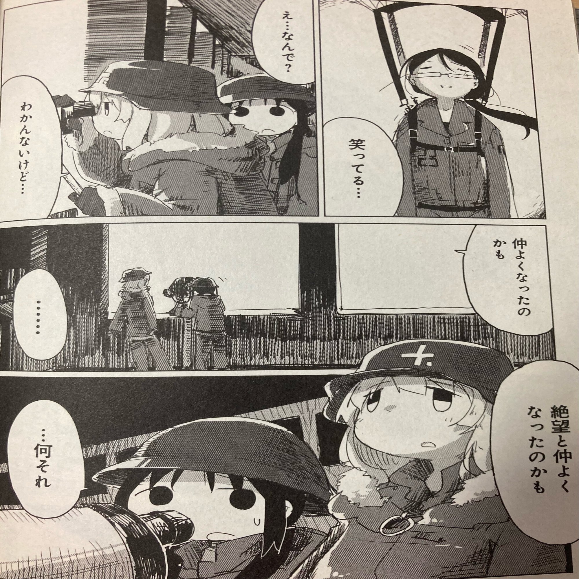 旅の途中で出会ったカナザワとイシイが、それぞれ地図作り、自作飛行機による対岸への渡航といった自身の目的を失いながらも、なお失望せず立ち直ることができたのも、「なぜか?」と問うのを止め、「絶望」的な無目的という事態と「仲良く」なることができたからかもしれません。そんな意味なきものを意味なきものとして歓迎して迎え入れる彼女達の姿を見て、希望や勇気を抱かずにおれるでしょうか。感動せずにいられるでしょうか。