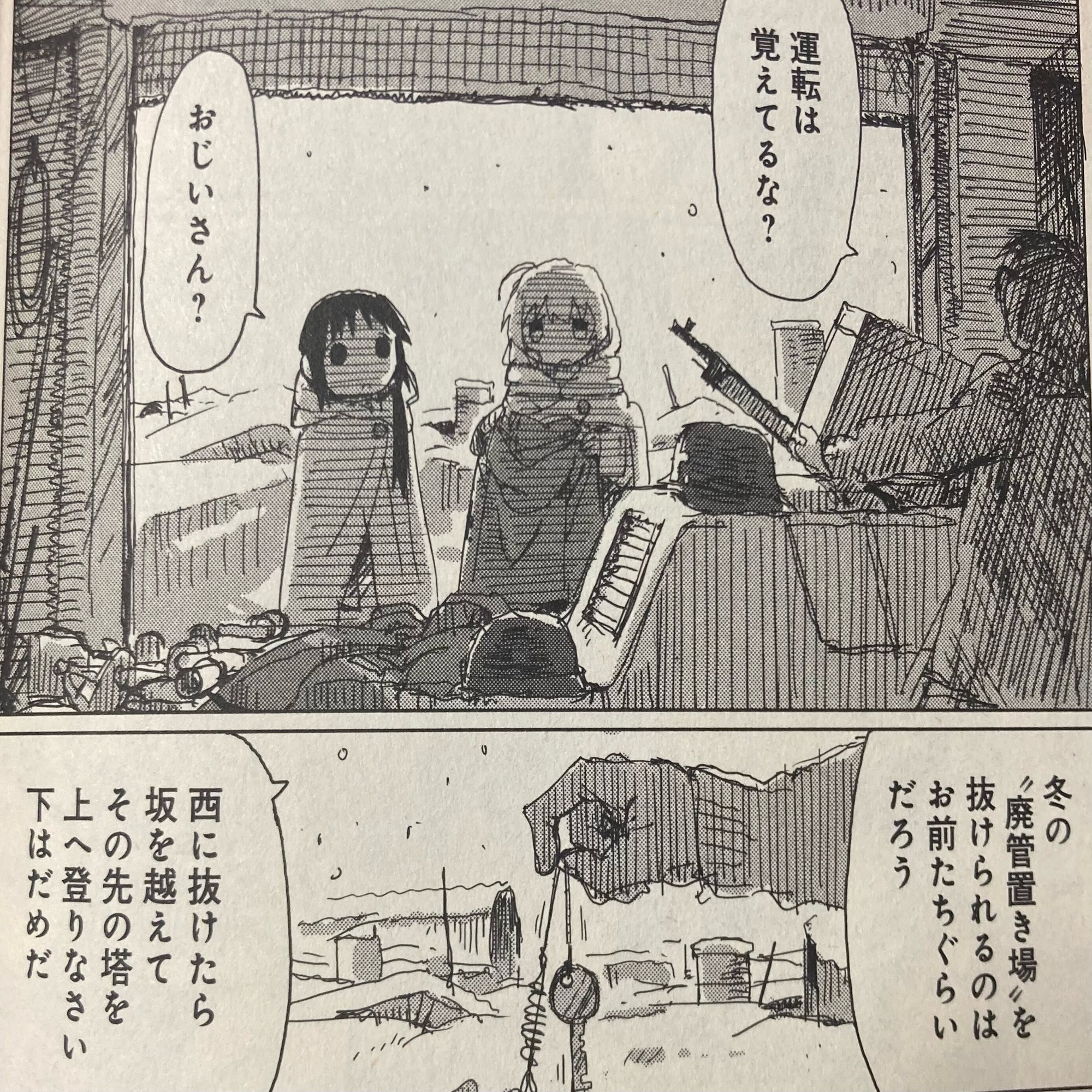 この「生きること」について語られる物語の中で、主人公であるチトとユーリは旅を続けます。文明崩壊後の世界を生きる彼女達には、従うべき文化的規範も、信仰すべき宗教も、所属する共同体も存在しません。本来であれば生きる指針、あるいは意味を提供してくれるはずの基盤が、二人には欠けているように見えます。二人はまるで拠り所なきまま、ただよいながら生きているかのようです。ニーチェの以下の言葉を基に考えると、彼女達のこのような生はニヒリズムのただなかにあると言ってもよさそうです。