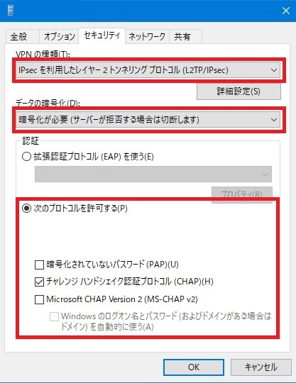 もし、全く同じエラーが出たら、変更③の部分でMicrosoft CHAP Version 2 (MS-CHAP v2)にもチェックを入れてみましょう。