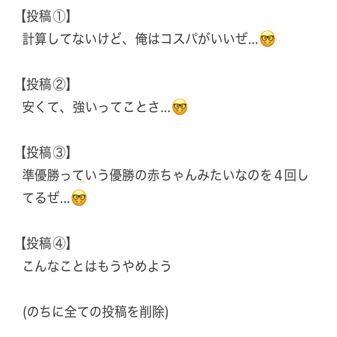 ただ後に「自分を道化に演出しすぎる投稿は控えよう」と思い至り、投稿④の後に全てのポストを削除しています。