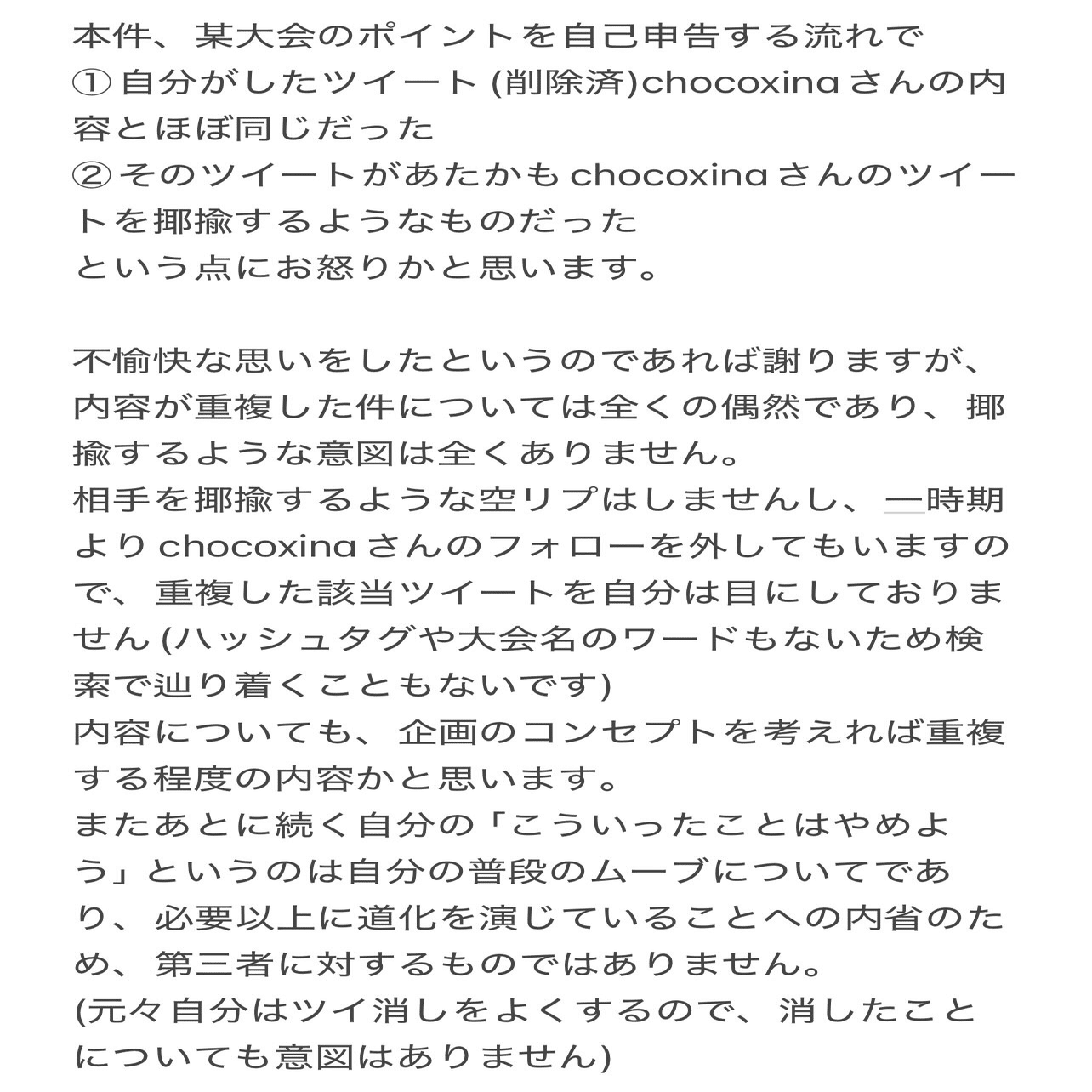 尚、上記ポストは私にリプライ/引用RPする形ではありません。また今に至るまでchocoxina氏から直接連絡は一度もいただいておりません。