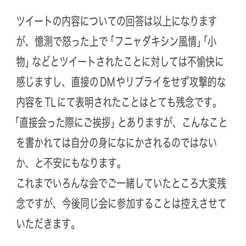 私に対して攻撃的な姿勢を取ったことに対する謝罪や撤回がなかったことについて遺憾ではありましたが、これ以上本件について触れる必要はないと思い、やり取りを終了しました。