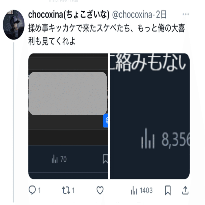 当時私はchocoxina氏をフォローしておらず、【自分から相手方の投稿を閲覧しに行く】ことがない限り、chocoxina氏のポスト内容を知り得ないことを重ねて申し上げます。
