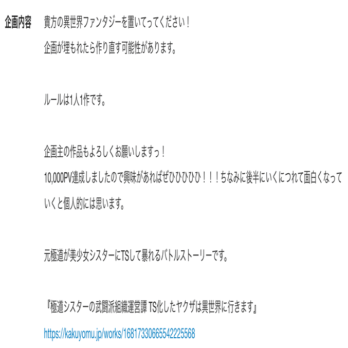 加えて、昔からWeb小説という概念は人気を博した根源的な時代(スタートライン)から、『世間一般的なメジャー』からズレている、アングラな層のための短絡的・即物的な娯楽という性質を強く持っているコンテンツなので、結局その流れを汲んだ人気のWeb小説投稿サイトでは「面白さの保証」がない「途中や最後まで読んでみないと展開や内容がわからない」作品は誰も読まない。