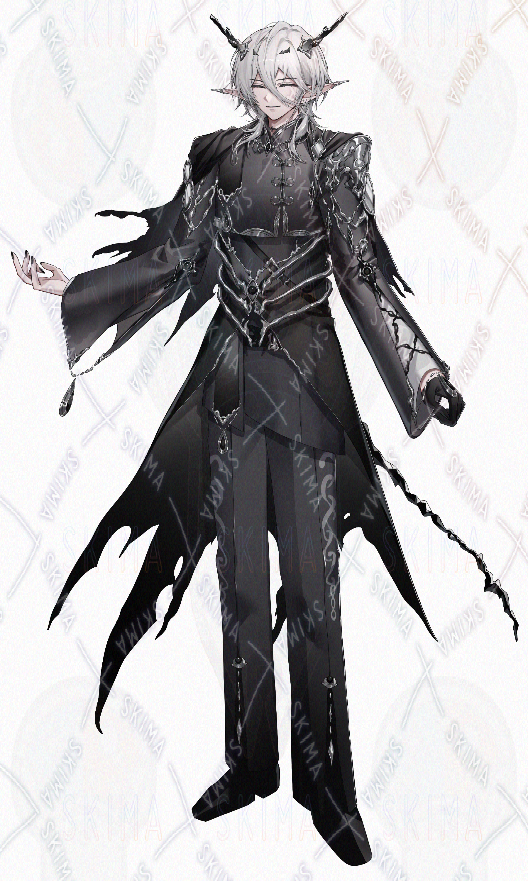青年/美少年/白髪/ウルフカット/角/ほくろ/赤目/ピアス/チャイナ/中華/貴族/厚塗