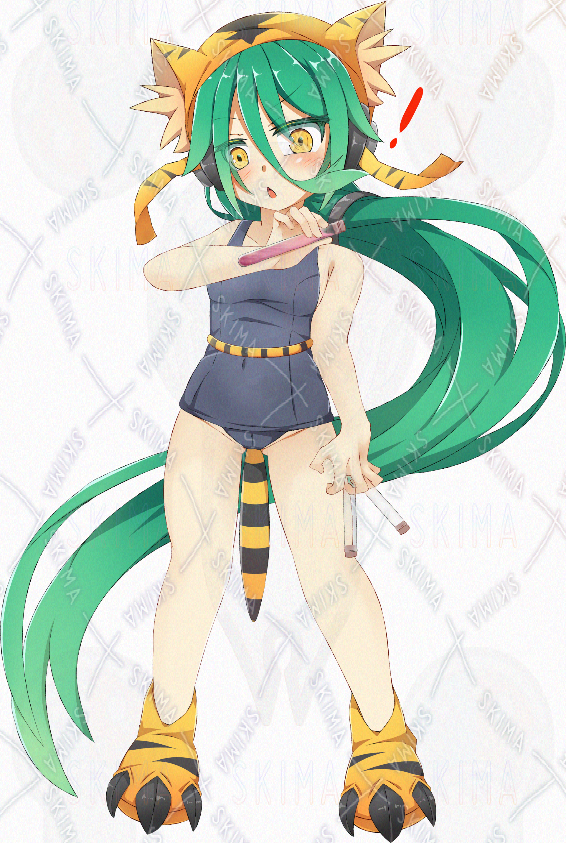 トラ柄のスリッパに帽子と着け尻尾、スク水が私服