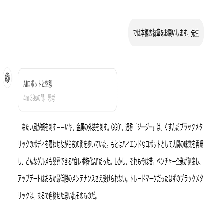 なお、普通のo1でも十分に創作は可能ですが、短編にしては設定が盛り込みすぎな部分もあるので、要素を取捨選択してから執筆を進めたほうがいいという印象です。