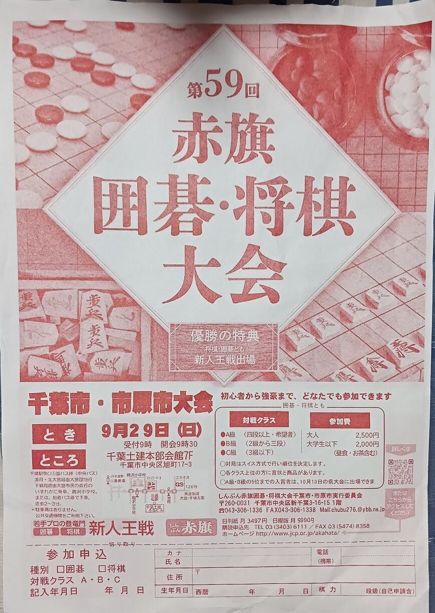 2024年08月13日 囲碁将棋大会にご参加を 本日からお盆でお休みになっています。家事に没頭しています。さて、囲碁将棋大会が9月29日に千葉市・市原市大会が千葉土建本部会館にて開催されます。 この大会で勝つと県大会、全国の大会があります。初心者からでも参加でき、プロの方が来てくださいます。参加費は大人2500円(昼食・お茶含む)大学生以下は2000円です。 ぜひ、興味関心のある方はご参加ください。 「日本共産党の活動」カテゴリの最新記事 地域訪問など 千葉土建千葉支部の旗開き&とんぼの会で災害問題を話しました。 朝日ヶ丘でKさんと訪問&地元検見川町会の新年会に久しぶりに出席しました。 核兵器禁止条約の批准を求める署名宣伝&山添拓さんとのつどいでお仲間が増えました。 幕張&花園地域などを訪問 < 前の記事次の記事 > コメント コメントフォーム 名前 コメント 記事の評価 リセット リセット 顔 星 情報を記憶 コメントを投稿する