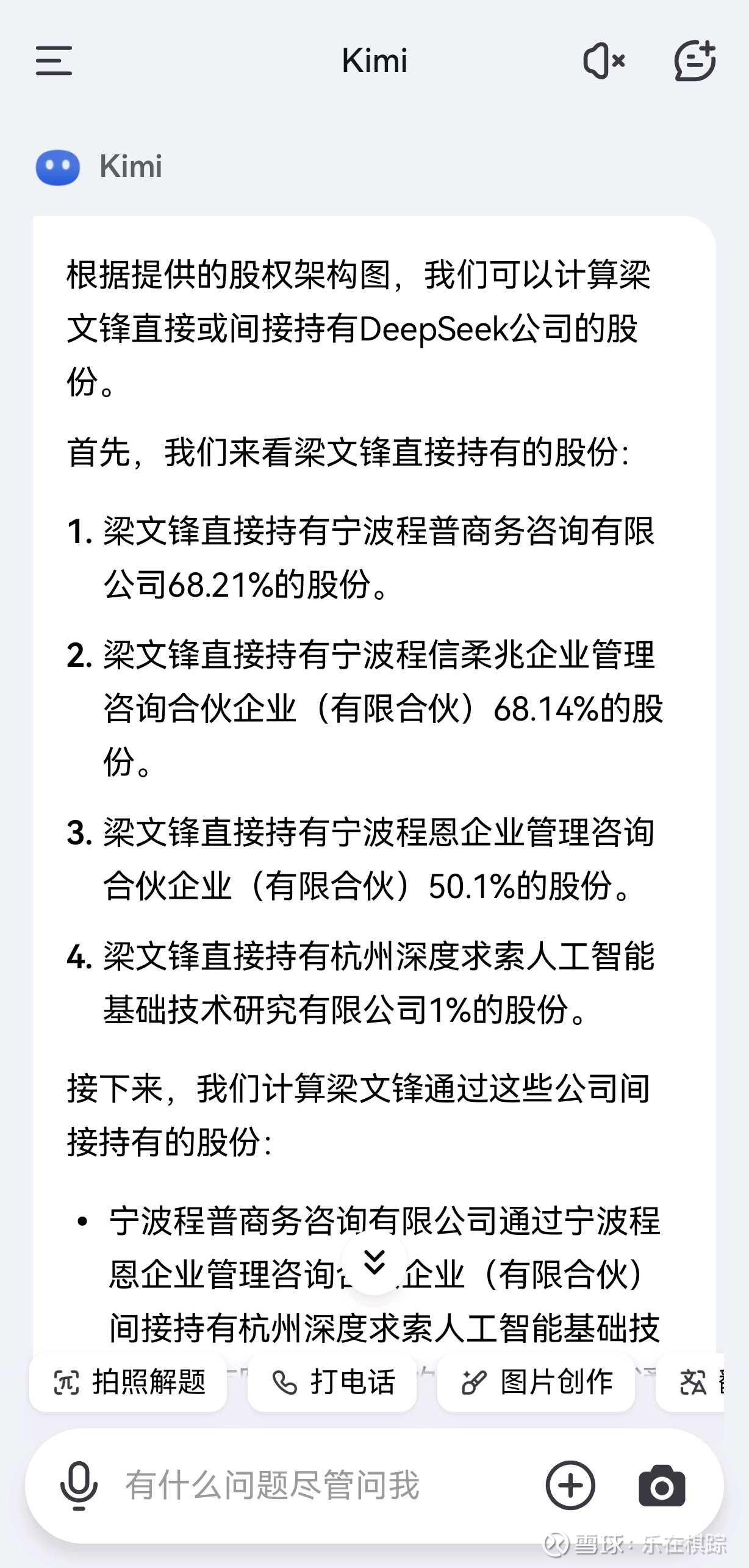 由于股份的持有是按照百分比计算的, 所以这里的总和超过了100%, 这是因为梁文锋通过不同的公司和合伙企业持有DeepSeek公司的股份, 而这些公司和合伙企业之间存在交叉持股的情况。 实际上, 梁文锋持有的股份应该是这些公司和合伙企业持有DeepSeek公司股份的总和, 即杭州深度求索人工智能基础技术研究有限公司的100%股份, 因为这是最终的持股公司。 查看图片//@无比蟋蟀:回复@乐在棋踪:能不能说明一下, 看得有点懵