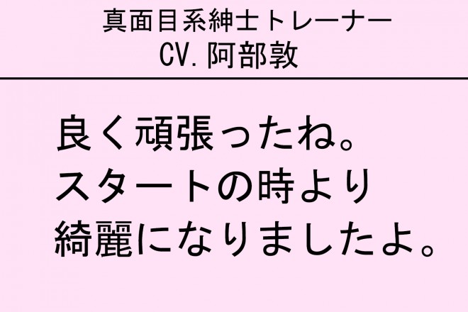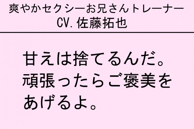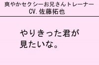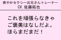 SAKUさん イケボトレーニングは声優とのコラボで、第1弾は佐藤拓也さん(『アイドリッシュセブン』十龍之介役、『ジョジョの奇妙な冒険』シーザー・アントニオ・ツェペリ役など)、第2弾は阿部敦さん(『アイドリッシュセブン』逢坂壮五役など)、第3弾は駒田航さん(『アイドルマスター SideM』古論クリス役、『ヒプノシスマイク-Division Rap Battle-』入間銃兎役など)、第4弾は杉山紀彰さん(『NARUTO-ナルト-』うちはサスケ役、『ヘタリアWorld Stars』イギリス役など)の撮り下ろしボイス。それぞれ30種類あり、お客様のトレーニングに合わせて、甘いボイスや気持ちが上がるような励ますフレーズなどをトレーナーが流して、モチベーションを高めます。すごく反響をいただいており、イケボトレーニング目当てで入会される声優ファンの方も多くいます。