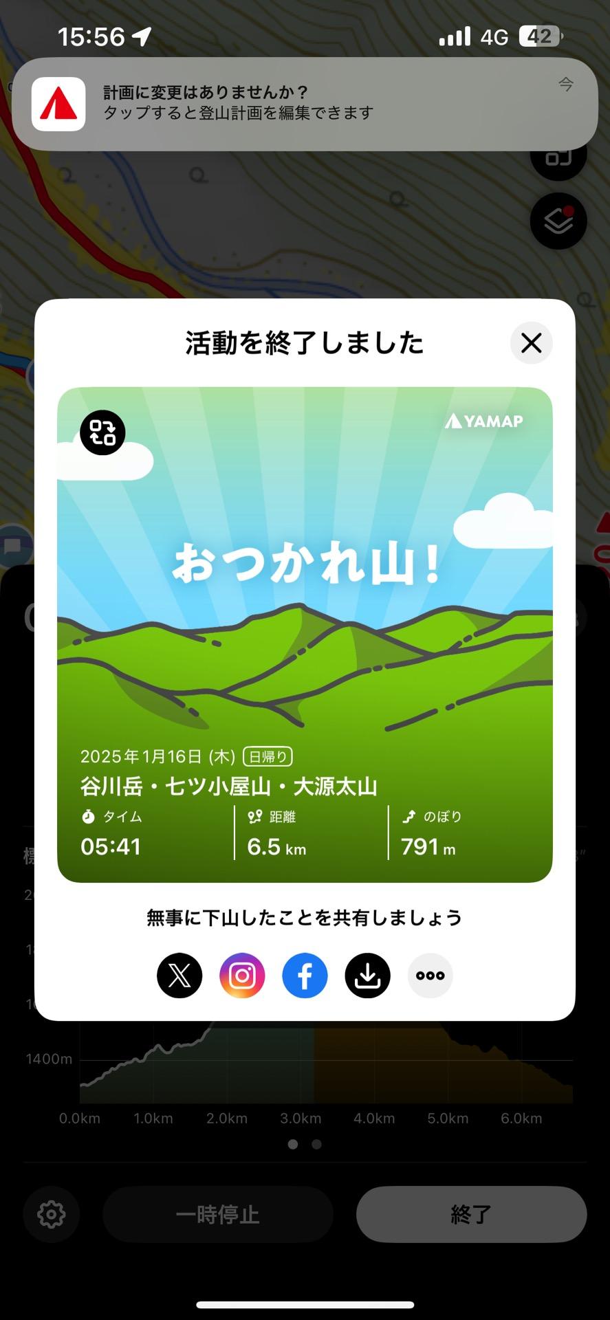 すべて見るとてつもなく長文なので、見ない人は見ないでね。 ただ、遭難案件なので、参考になるかどうかわかりませんが、恥ずかしながらレポ投稿します。 こんな大失態、書くべきどうか、、、、、 谷川岳の手前の雪庇で滑落しました 死んでもおかしくないと思う。 恥ずかしながら、皆さんの啓発の為に、レポします。 とりあえず、生きて帰ってきたから、レポできました。 前日、仕事終わりに名古屋16時発、途中で温泉♨️立ち寄り、水上ICには0:10頃到着。 この日は、高速でも大雪で視界も見えにくい。 IC降りてすぐに、道路は大雪、果たして、谷川ロープウェイ駅まで到着できるのか? ローウェイ駅に近づくにつれて、道路は大雪。 最後のスノーシェード過ぎて車がスタック🚗 雪はバンパーより上にある。 前にも後ろにもどうにもならない。 何とか知恵でスタック脱出。経過時間1.5時間。 駅まで無理なので、スノーシェードまで戻り、朝に除雪車来るまで、待機。 この時点で、西黒尾根は無理。 ロープウェイ🚡の開始時間は9:30でした。 たまたま、駐車した真向かいに福井ナンバー🚗の方と意気投合。 ロープウェイ🚡に一緒に乗り、さぁ〜スーパーラッセルだー♪ 今日は自分ワカン、福井の方スノーシューで2名体制で行く。 後ろの登山者10名はチェンスパやアイゼンでラッセルする気なし。 この10名は完全にラッセル泥棒でした。 無駄に1時間経過して、谷川岳の天神尾根取り付きに到着。 この後のトレースハンター10名は脱落。 2人でラッセルしながら谷川岳に向かう。 福井にーさんが小屋前の大岩で大休憩したので、自分は先にトレース作るために、ソロ先行した。 こらが全ての過ち。 谷川岳避難小屋で福井にーさんを待てば良かったものの、ソロでピークハントに行く。 昨夜からの大雪で60センチ降ったとの事。 谷川岳ピーク手前の最後の登りで、何故か右側の稜線に進んでしまい、左に方向修正しようとした瞬間、あの雪庇が自分の身体ごと、転げ落ちる。 この時はハードシェルの風防とバラクラバ、ゴーグルを着けていた。ゴーグルは曇っていた。稜線は風とガス、雪で前が見えないホワイトアウトと最悪なコンディションでした。 雪庇を踏み抜いた瞬間に身体が真っ逆様に転げ落ちる。何とか止まるようにしようが、重力とスピードでどうにもならない。 あーーー死んだ、詰んだと思いながら無我夢中で身体が停止する事にもがきながら、何とか口に入ってくる雪を舌でかき出そうとするも、何ともならない。 あーこうやって、雪崩に巻き込まれた人は窒息して死ぬんだと、自己体験した。 雪が口に喉奥に詰まってくる恐怖は、、、サーフィンやっている時に台風のビッグウェーブに飲まれた時、人間ではあながえなく、呼吸が出来ない状況と酷似していた。 とにかく、呼吸困難になる。 何とか、滑落が止まった。滑落はおそらく3分〜5分くらいと思う。1977メートルの谷川岳から1341メートルまで滑落しました。 630メートル位落ちた。 身体は止まったけれど、雪の重みや口の中に雪が入ってくるのに、必死に抵抗した。 5分ほどもがき苦しみ、何とか体制立て直した。 幸い怪我は無く、ただ舌は雪のせいか、擦過傷になり口の中は血まみれです。ストック2本失った。幸いにワカンは装着されていたので、一安心。しばらく放心状態でした。 落ちてきた場所は画像で記載します。情け無い、、、 この時13:15頃、幸いにもこのまま降れば、一般登山道に合流できる場所だったので、レスキュー🛟呼ばず、自力で下山する事にしました。 だって、Yahooニュースに載るの残念だし、五体満足だったので、日が落ちる前に下山できると思った。 ただ、下りとはいえ、とてつもないラッセル地獄。ワカン着けて腰までのラッセルでした。 ようやく国道の林道に着いた頃にヘリ🚁の音が聞こえる。まさか、一緒に登っていた福井にーさんがレスキュー呼んだと確信。すぐに119して安否を伝える。今いる場所、あとどのくらいでロープウェイ駅に着くとか伝えた。 とても残念な事に、110された福井にーさんが自分の車ナンバーを伝えたお陰で、警察の方が嫁さんに連絡したらしい、、、、、ご主人は無事ですが、谷川岳で滑落したと、、、 いつも嫁には山に行ってくるとしか言わないので、どこの山に行っているのか、知らないので、嫁は恥をかいたと言っていた。もちろん激怒😡 程なくして、ロープウェイ駅に到着すると、レスキュー隊員3名と警察2名の事情聴取。 事細かく、時間場所、画像を見せてどこようになったのかを伝えた。 正直、ここまで雪が深く、もちろんノートレスで、視界不良としても、この雪庇滑落は言い訳出来ない程、情け無い。 今回の滑落はたまたま、落ちた場所に岩や木が無く、身体が止まった場所も良かったので、運が良かったとしか言いようがない。命あっての楽しい山登りが当たり前と思う事は出来ない。 もちろん、嫁や実母からもしばらく?もしくは謹慎となる事は必至です。