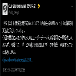 2022/11/29、セルシス社が、12/6に公開する同社製のペイントソフトCLIP STUDIO PAINT v1.13.0に、AIアシスト機能を追加すると発表。