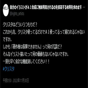 12/3になって、セルシスは同機能の実装を見送ったうえで、さらに「今後、画像生成AIを用いた機能をCLIP STUDIO PAINTに搭載いたしません」と発表した。この時既にAdobeがFireflyの開発を表明していたため、それと入れ替わる形で、クリスタは永久にAIアシスト機能を失う結果になった。
