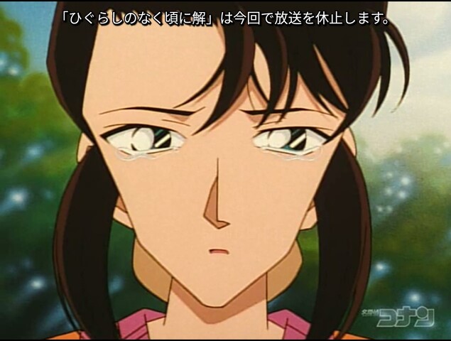 事件直後だから放送自粛というだけならまだいいけど これがきっかけで規制が厳しくなり打ち切りってのもあるかもしれないね。 コナンは一樹が自殺ではなく秀友伝説を利用して殺された殺人事件であると確信する 東海テレビでは、ひぐらしも放送中止になるとのウワサ。