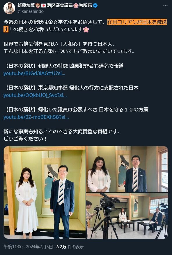 - 新藤加菜は「在日コリアンが日本を滅ぼす」などと堂々と投稿できてしまう人間であること。