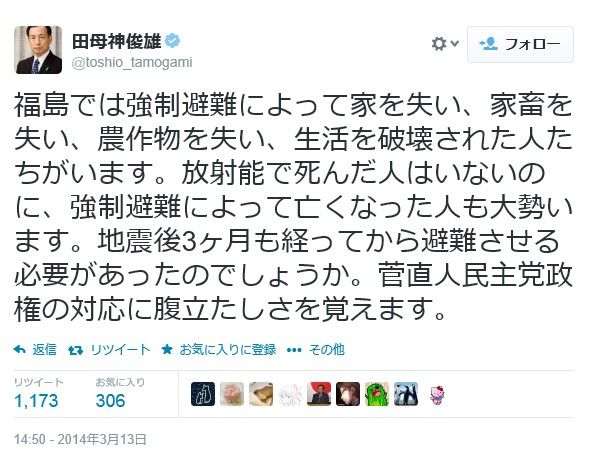 普通に考えれば、原発事故がなければ避難もなかったのだから、原発の安全性に対する疑問が出てくるだろうに、彼はいまだに原発安全神話を信じていて、事故が起きたにもかかわらず、事故現場周辺まで安全だと思い込み、住民を避難させたことに怒りを感じているのです。結論ありきで現実を歪めているようにしか私には見えません。「科学的根拠なしに住民を避難させた」と言う田母神氏ですが、彼の福島原発周辺安全論こそ、何の根拠もありません。