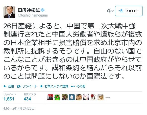 中国で起きている損害賠償請求については、私もおかしなものだと思っています。1972年の日中国交正常化の時の共同声明で「中華人民共和国政府は、中日両国国民の友好のために、日本国に対する戦争賠償の請求を放棄することを宣言する」となっていて(外務省HP)、この共同声明とサンフランシスコ平和条約との関係から、個人請求権もないと日本の最高裁判所は解釈しています(参照)。