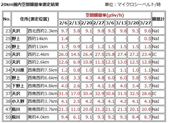 ICRP(国際放射線防護委員会)の勧告に基づいて、日本が定めている「一般人が浴びても差し支えない」としている被曝線量は1ミリ㏜(=1000μ㏜)、原発作業員でさえ「年間最大50ミリ㏜、5年で100ミリ㏜」(つまり年間平均20ミリ㏜)という基準になっています(原子力機構HP)。1ミリ㏜なら、毎時0.114μ㏜、20ミリ㏜なら毎時2.283μ㏜です。20キロ圏内には、原発作業員の被曝線量限度をはるかに超える地域が点在していることが分かります。