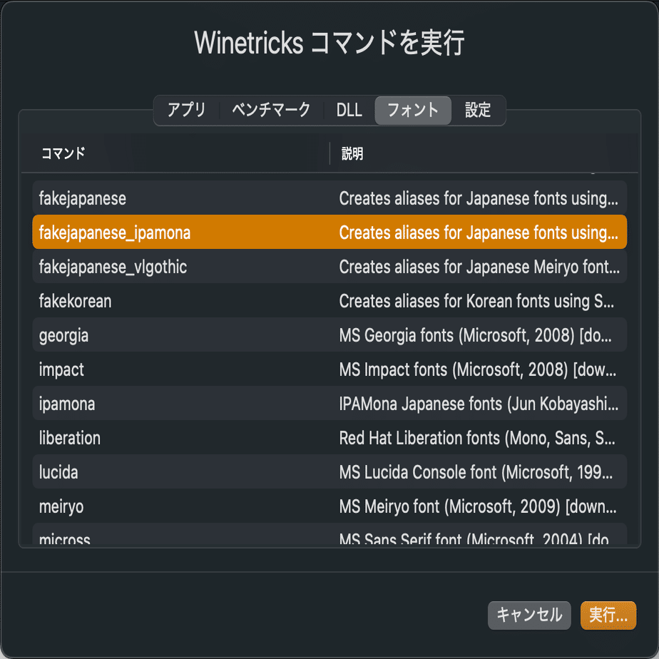 Bottle を作成したら、次は右下のWinetricks…から設定です