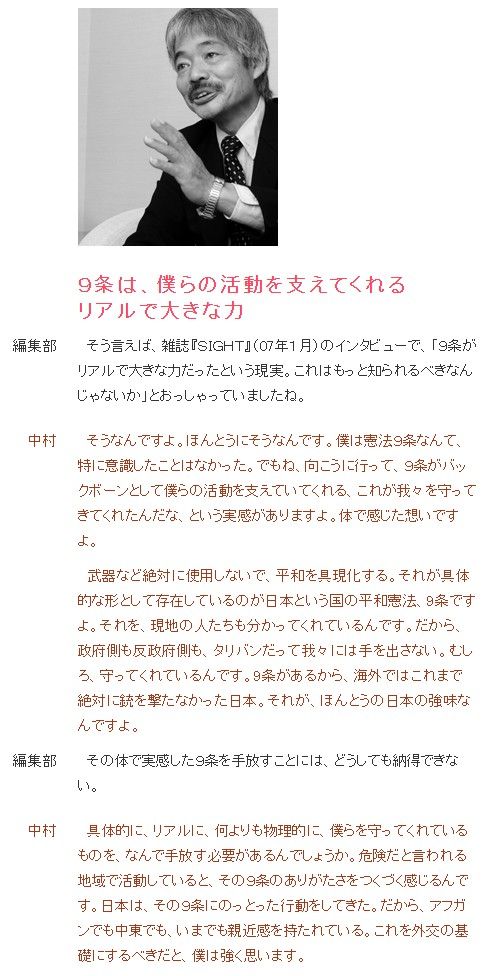 アフガンで人道支援活動をしている中村哲氏は、「9条のおかげでアフガンでも自分たち日本人は攻撃されない」と言っていますが、それは「9条があるから攻撃されない」ではなく、「日本が9条にのっとって、戦争をしないで平和的な活動をしてきたから、『平和国家』の人間として信頼される」と言っているのです。
