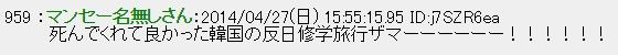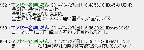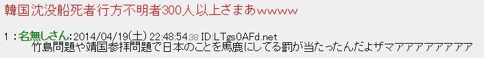 繰り返し言いますが、ネット掲示板の書き込みなんてものは社会全体の意見を投影しているものでもなんでもなく、ありません。「セウォル号沈没をお祝いします」「バカチョンがくたばってよかったw」というのが日本の総意でないのと同じことです。