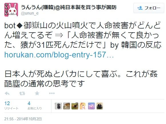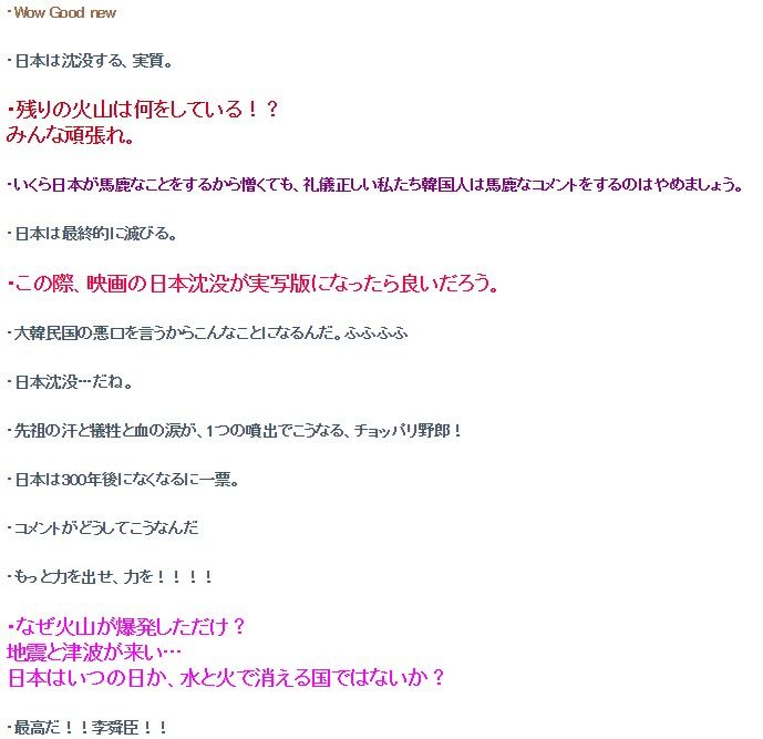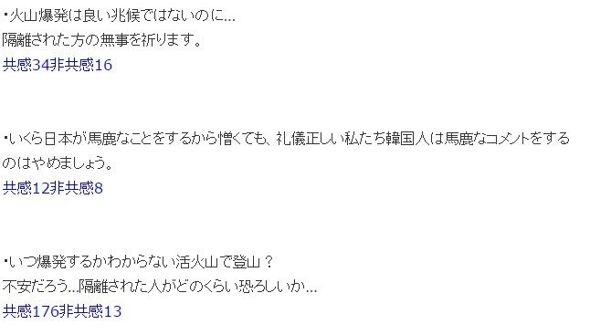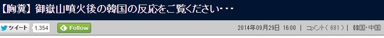 先日の御嶽山噴火について、色々な海外の反応まとめサイトで「韓国の反応」というのが取り上げられ、ツイッターのトレンドにまで入りました。その多くは「韓国人が日本の不幸を喜んでいる」という内容でした。