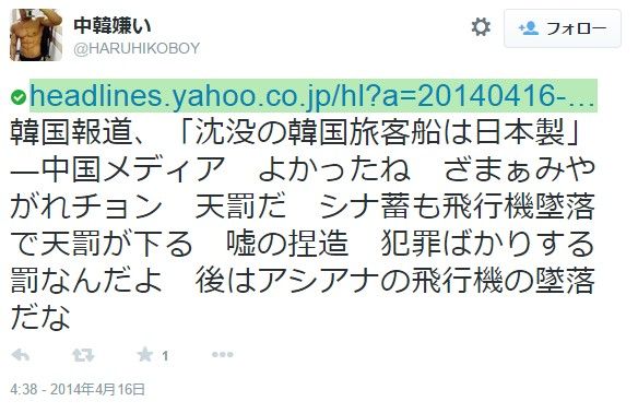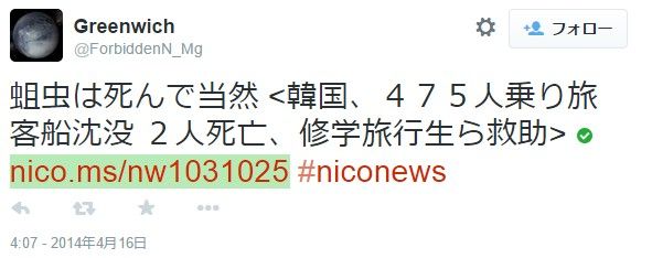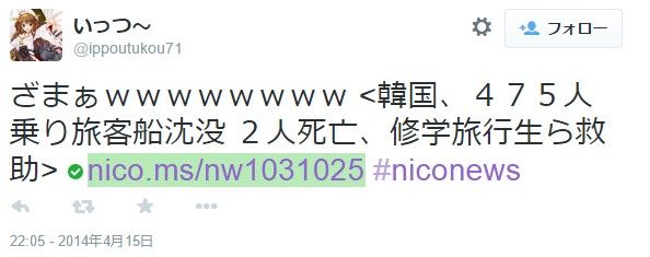 よりわかりやすい例を見てみましょう。3月に起きた韓国のセウォル号沈没事件で、日本の掲示板やツイッターの書き込まれた内容です。