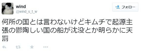 「鬱陶しい国の船が沈没とか明らかに天罰」