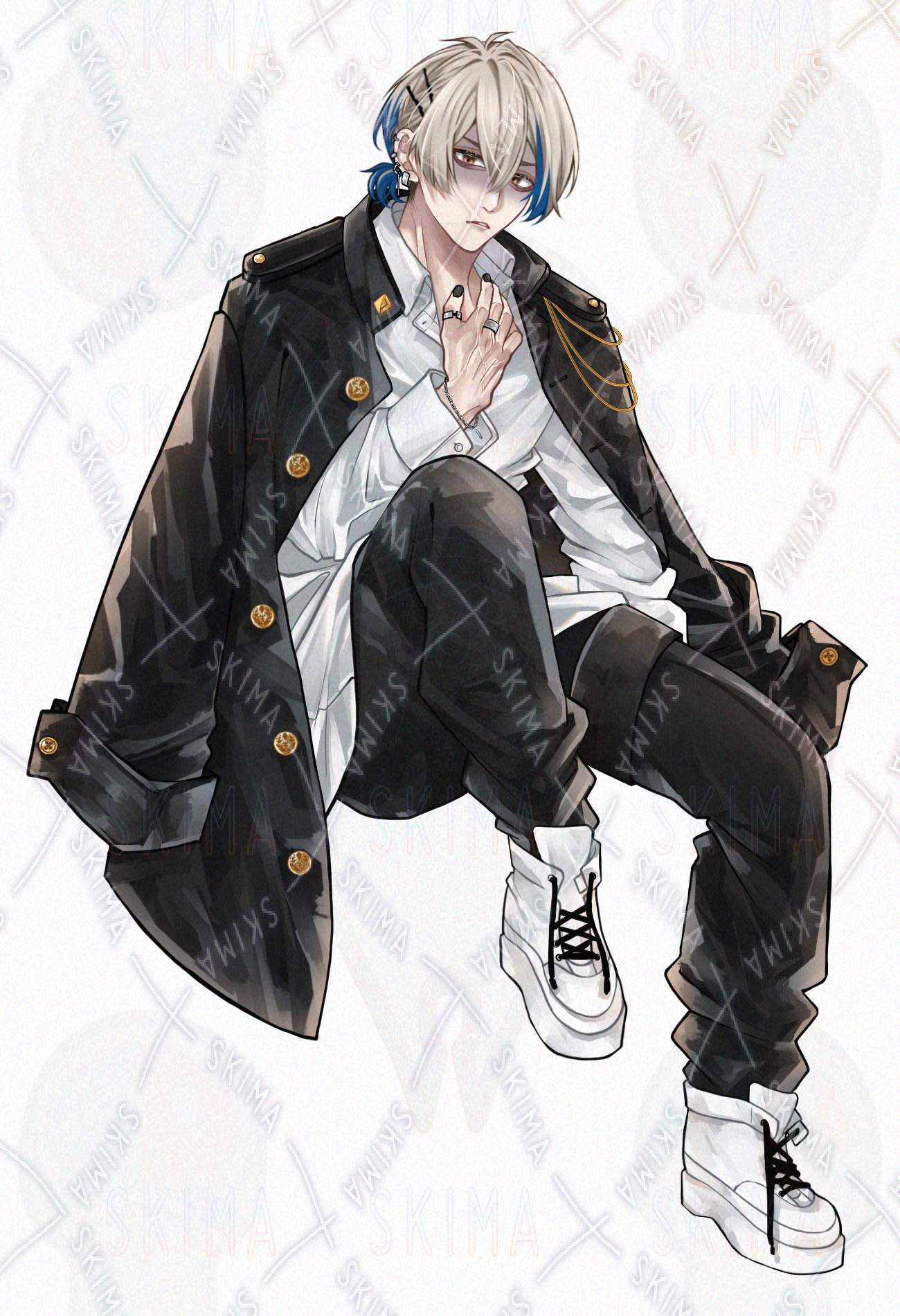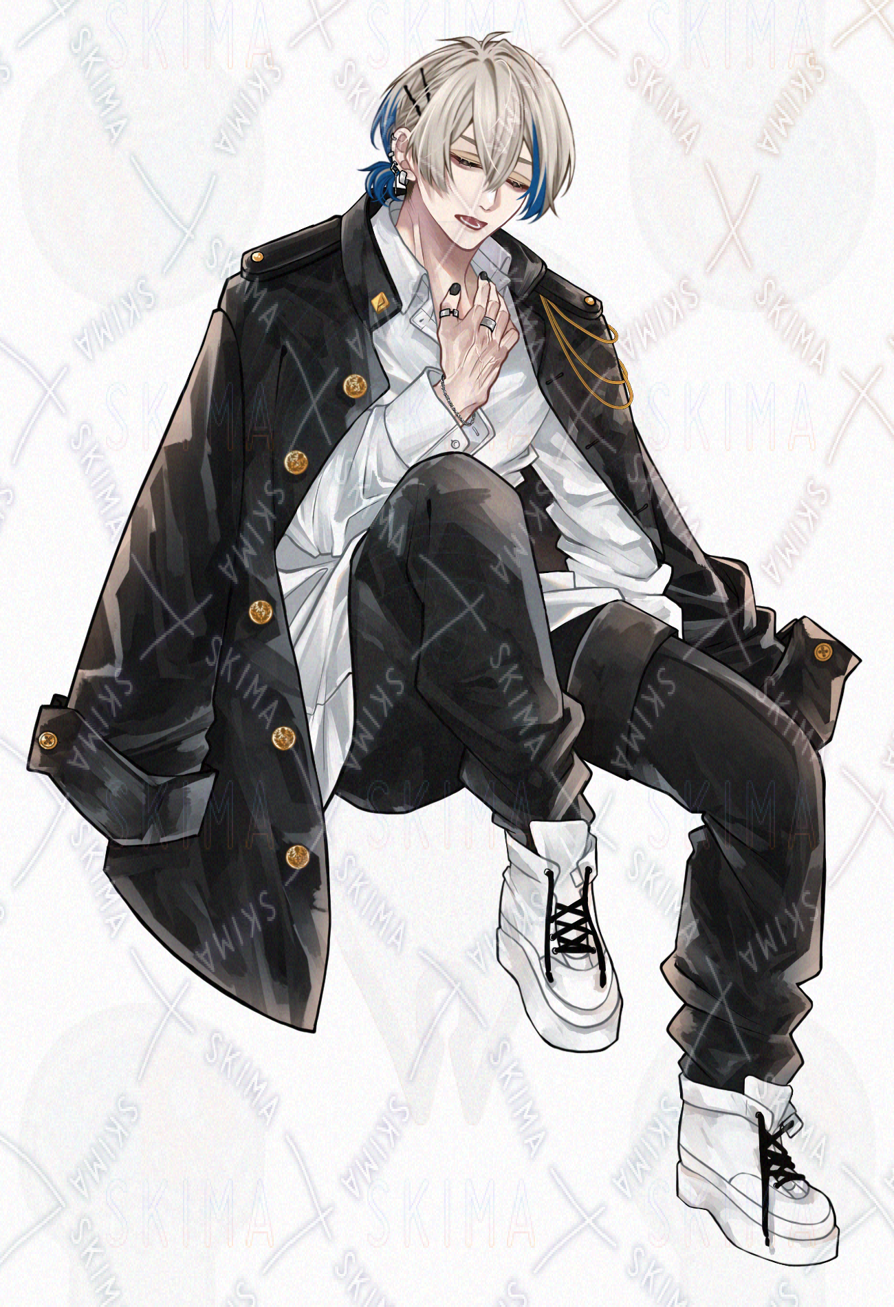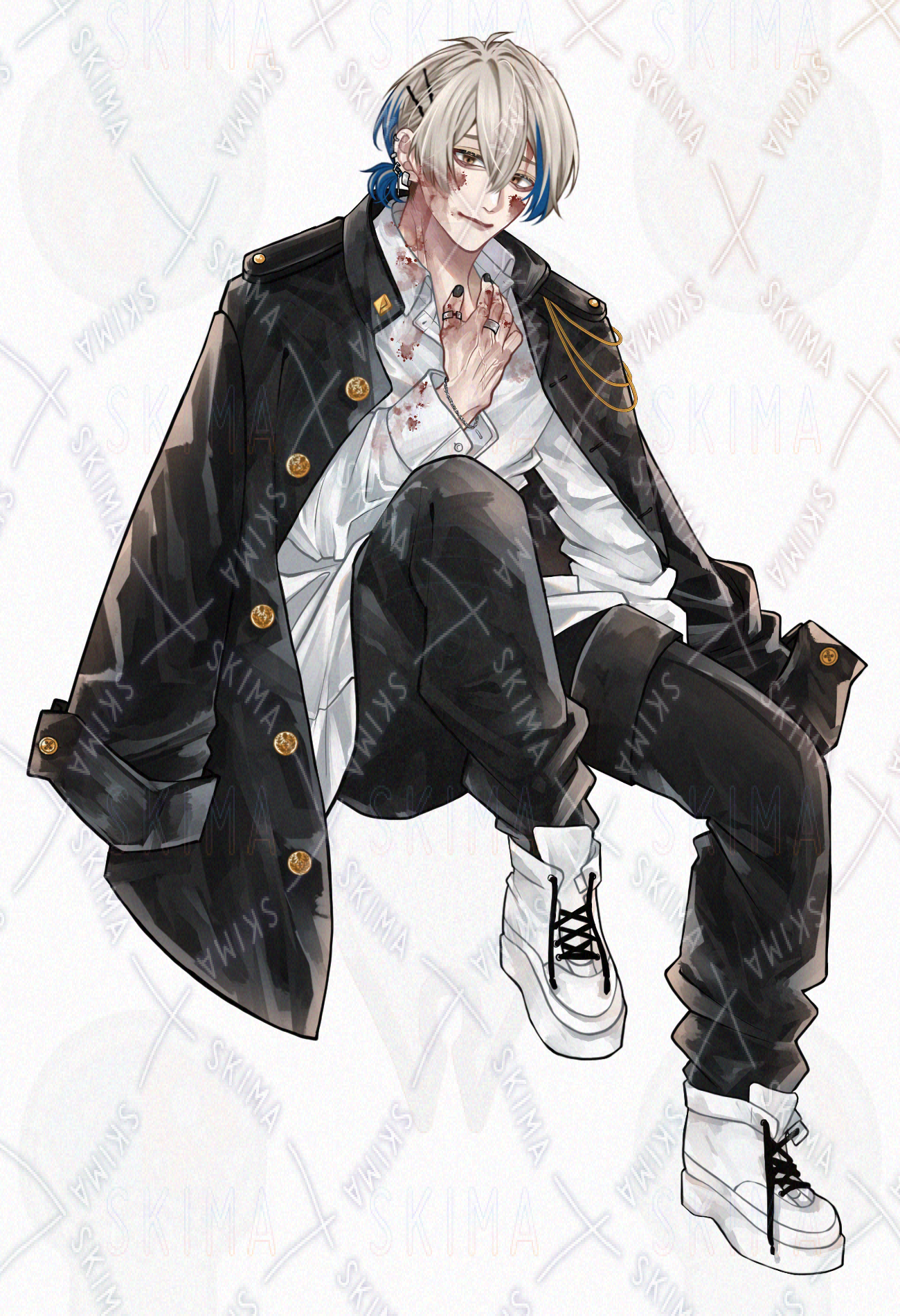 金髪/学ラン/軍服風/男の子/シャツ/男性キャラクター/立ち絵/TRPG/全身/制服/ピアス/青メッシュ/煙草/飴/ヘアピン/スニーカー/学生