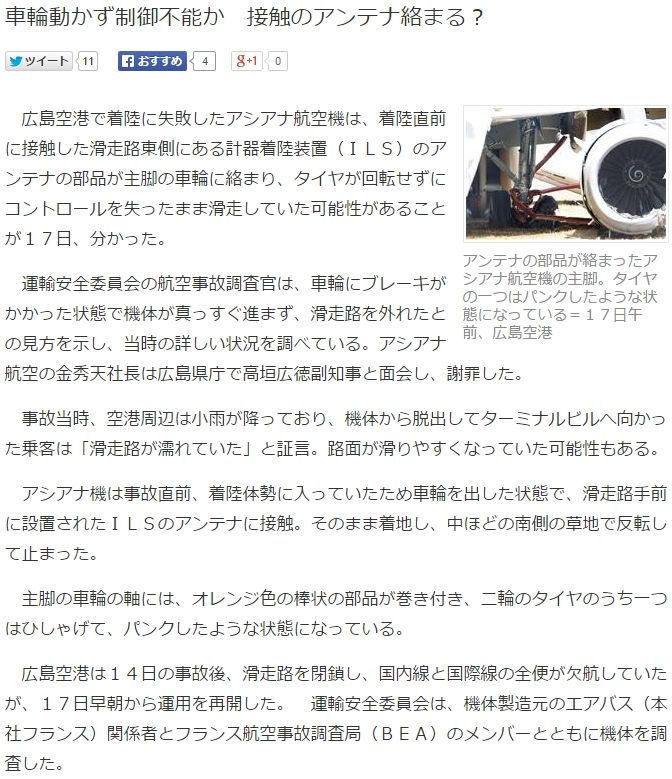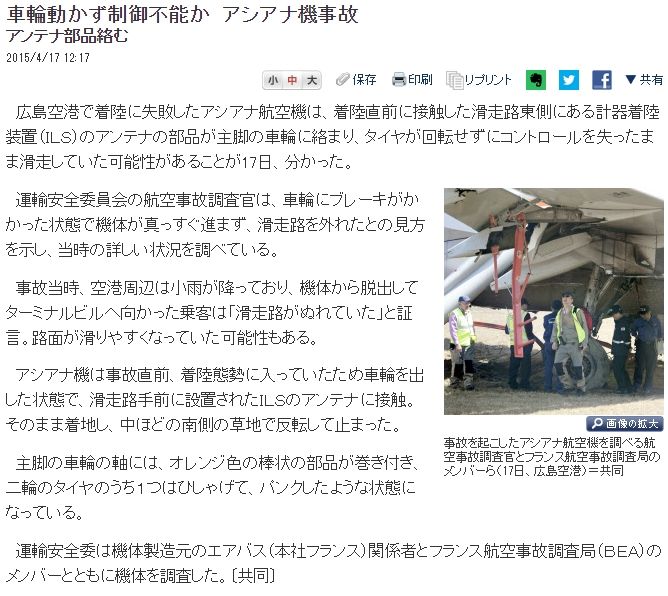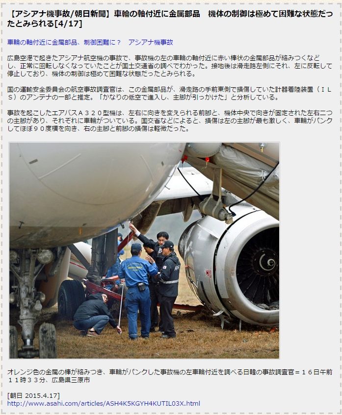 朝日新聞が事故原因は着陸装置のアンテナが車輪に絡まったからだと「最終決定」して、「広島空港に謝罪と賠償煽り報道」を開始したとしていますね。