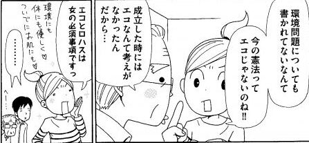 この「古い」という漠然としたイメージのまま、「今の憲法ってエコじゃない」などと意味不明な論理が展開されます。流石「マンガしか読まない」奥さんの言うことは発想の斜め上を超えていきます。