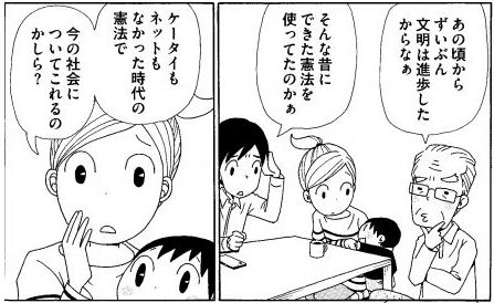 さて、この「ほのぼの一家」、作品の都合上しょうがないのでしょうが、異常なまでに無知な一家が主人公です。なんたって「70年前はインターネットもなく電話も村に一つ、みんな手紙だった」と言うと「ええっ!」「江戸時代ですか?」と意味不明なことを言うぐらいです。こんな無知な一家に憲法語られたくないですね。「江戸時代ですか?」というセリフも、「今の憲法は時代遅れだ」という印象を与えたいがための誇張表現でしょう。とにかく卑怯な印象操作を繰り返す自民党。