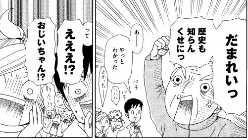 (余談ですが、この家族は「ほのぼの一家」と書いてありますが、お母さんとおじいちゃんはすぐに怒って大声を出すし、すぐに「ええっ!?」と大げさに驚くし、どの辺がどう「ほのぼの」しているのかは全く不明です。完全に「ギスギス一家」なのですが、「ほのぼの」と書くことで印象を和らげようとしているのでしょう。タイトルから嘘を吐く卑怯な自民党)