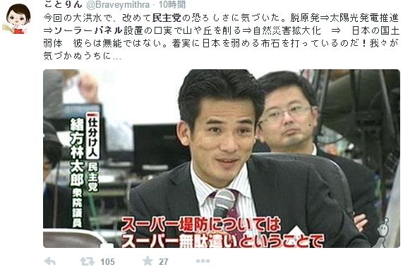 こちらの人など、「脱原発」もこのソーラーパネルも、「日本の国土弱体化」で「日本を弱める」ために行ったのだとのこと。じゃあ、原発を福島に設置して事故の大本を作ったり、今回のソーラーパネル設置時点の本当の政権与党である自民党はどれだけ日本弱体化を目指し取ることになるねん…。ちなみにこのことりん@Braveymithraという人は、嫌韓デマツイートを流しまくっている典型的なネトウヨさんです。